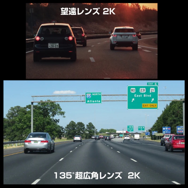 広角レンズと望遠レンズを組み合わせ、前方135°の広範囲をカバーする一方、遠方のナンバープレートや標識など、重要な情報を詳細に記録します。視野を広く、かつ遠方まで鮮明に捉えることで、死角をなくし、長距離運転や高速走行中の安全性を確保します。これにより、ドライバーは前もって状況を把握し、素早い判断を下せます。