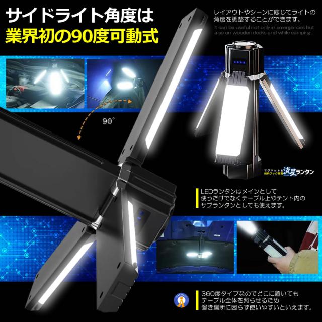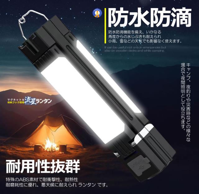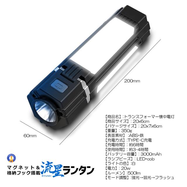 ●4種類の使い分けができるトランスランタン置き型ライトや吊り下げ型ライトや懐中電灯や作業灯としてマルチに使える変形型の次世代LEDランタンです。●3方向のLED発光でフロア照射サイドに3面のCOBライトを採用しています。吊り下げ型として使用する場合は全方向に光を照射できます。●500LM強力照射の懐中電灯●3段階の明るさ調節調整●サイドライト角度は業界初の90度可動式●マグネット&格納フック搭載●防水防滴●耐用性抜群●3000mAh大容量バッテリー内蔵●TYPE-C充電商品サイズ: 20x6cm送料無料
