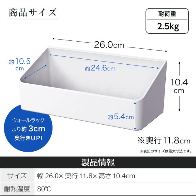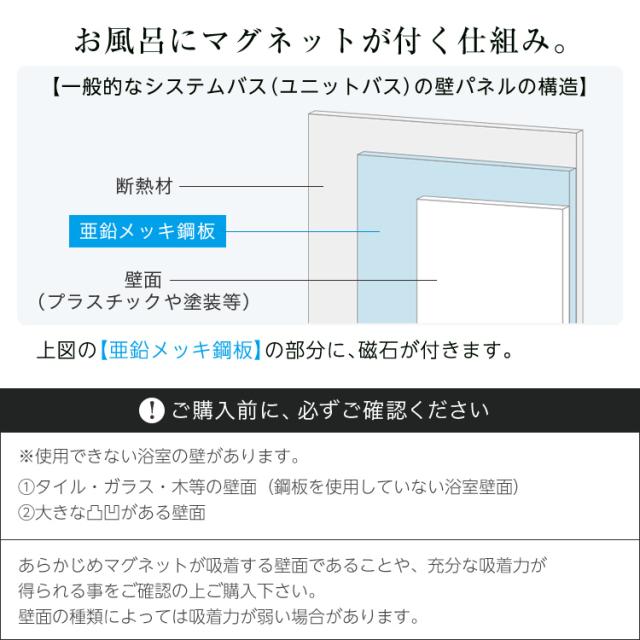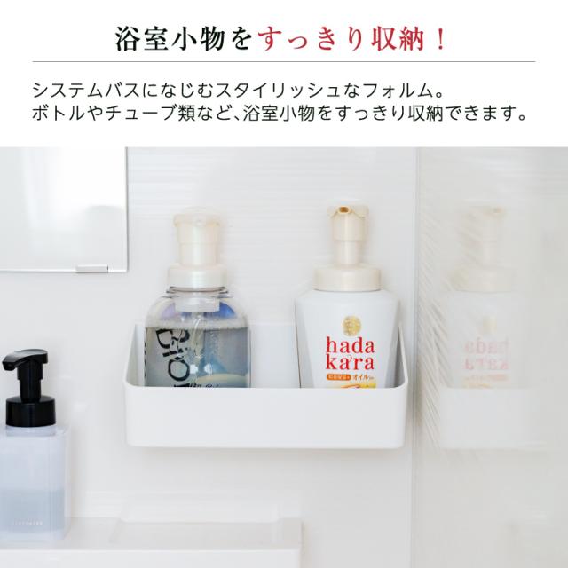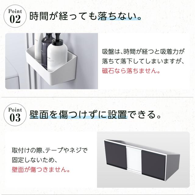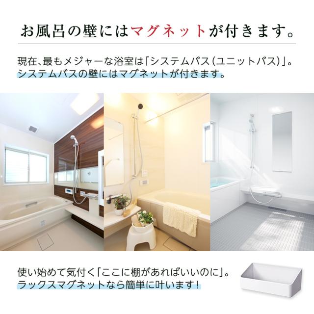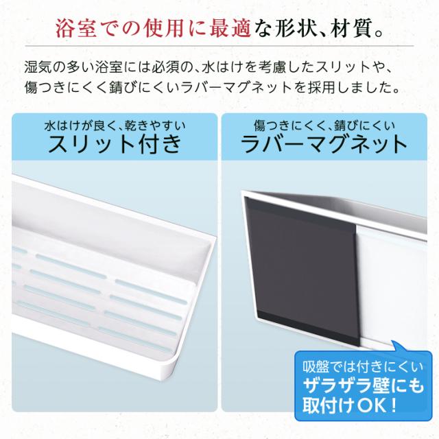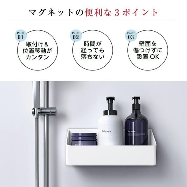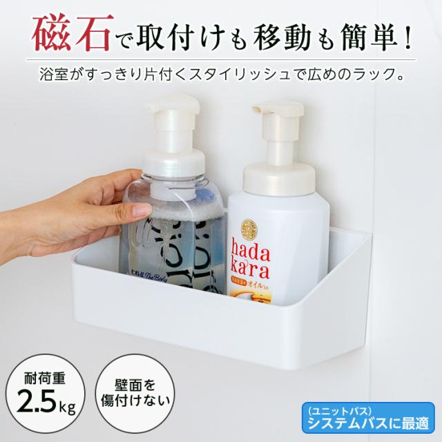 システムバスの壁面収納に最適!磁石の力でビタッとついて、浴室の壁を傷つけません。マグネットだから、使いたい場所に、取り出しやすい場所に、自由自在に取り付け、取り外しも簡単。洗顔料やシャンプー、リンスなどのチューブやボトル、洗剤など、様々なお風呂グッズをすっきり収納!水切り付きなのでお掃除も簡単。泡用など大き目ボトルも入る大き目ラックです。耐荷重 : 2.5kgサイズ : 幅32.8×奥行11.8×高さ10.4cm材質 : 本体=ABS樹脂/ラバーマグネット スベリ止め=ポリウレタン
