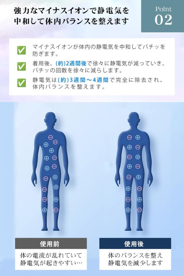 ・人体の電流の正負比を調整して、 静電気を徐々に減らす効果があります