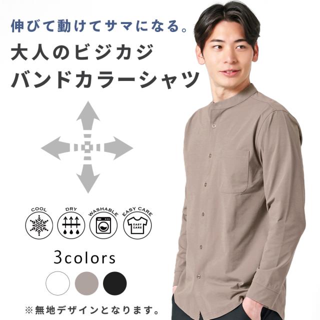バンドカラー 長袖シャツ メンズ 無地 襟なし ビジネス オフィス 羽織 ストレッチ 軽い らくちん 吸汗速乾 冷感 おしゃれ シンプル きれいめ カジュアル 春 夏 秋 洗える 通勤 在宅 アーバンスクエア 35318