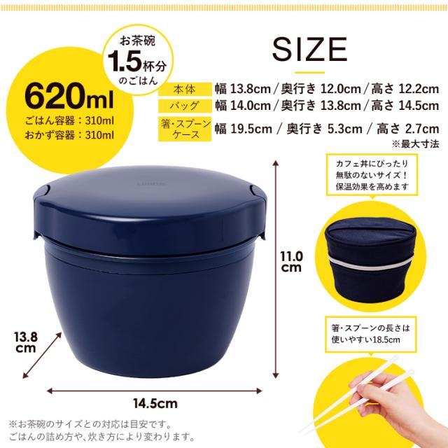 いつでもどこでも温かご飯が美味しく食べられるカフェ丼ランチ。ステンレス真空断熱構造で、保温・保冷で、中身の温度を保ちます。丼タイプなので、カレーや親子丼、パスタなど、お弁当のバリエーションが広がります。丼ぶり形状で、お子様でも食べやすく、おかずも詰めやすいので、お母さんも大助かり。食洗器にも対応、忙しい家事の短縮にも。レンジで、温め直しもできます。しっかり食べられる普通サイズ620ml。保温バッグとコンビセット付き。