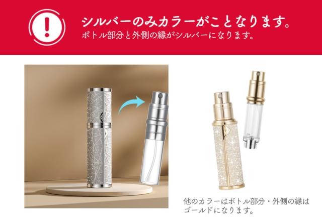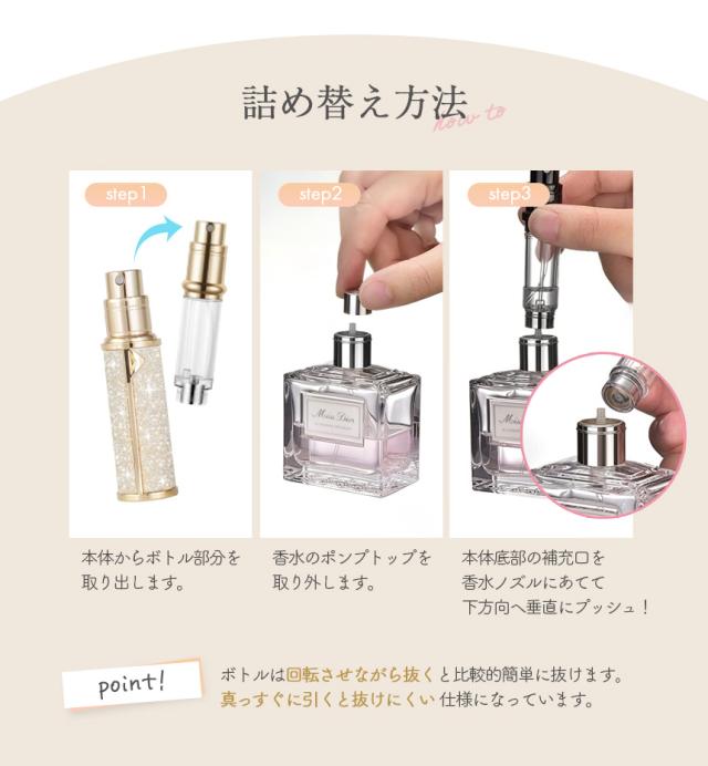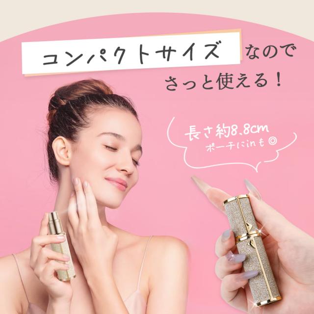 光り輝く高級感、ラメで輝く! 香水アトマイザー【クイックチャージ式で道具不要】道具いらず、こぼれにくい!クイックチャージ式なので、専用の道具は必要ありません。スポイトなど補助的な工具不要!手が汚れず、数回のプッシュで補充できます。【漏れ防止・高密閉性】圧力バルブにより、空気圧の変動による液漏れを防ぎ、機内持ち込み可能です。噴射口は内蔵され、噴霧部分はアルミニウム合金の材質で作られているので底部は独特的な金属バルブ構造に加え、外層は堅牢な金属ケースを備えて高密閉性を実現!