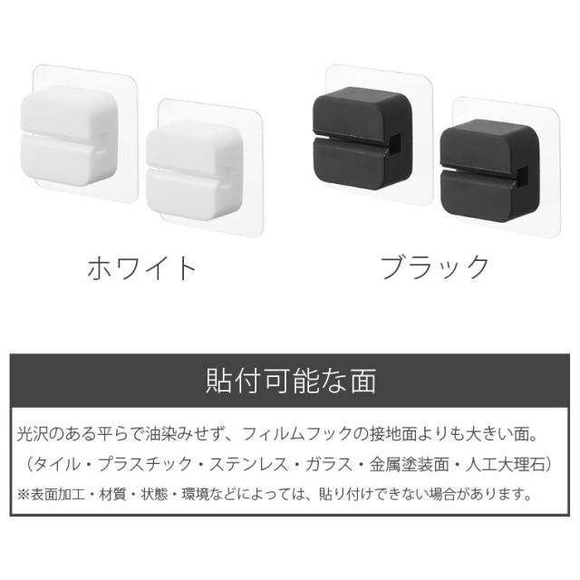 | 使える面 | 光沢のある平らな油染みしない面で、フィルムフックの接地面よりも大きい面。 タイル・プラスチック・ステンレス・ガラス・金属塗装面・人工大理石 ※表面加工・材質・状態・環境などによっては、貼り付けできない場合があります。 |