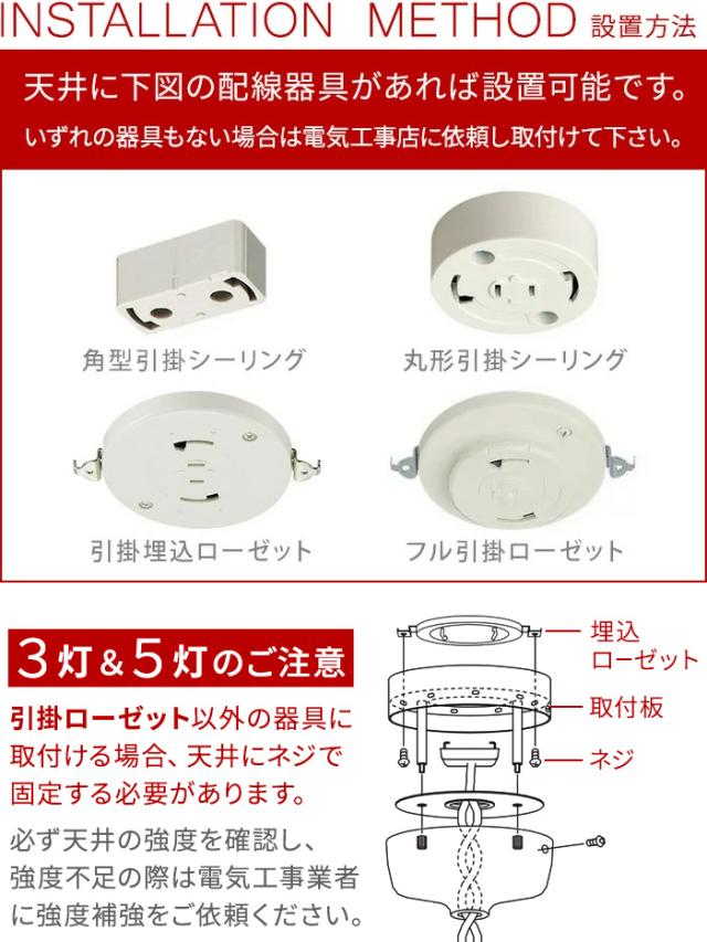| 引掛ローゼット以外の器具に取付ける場合、天井にネジで固定する必要があります。必ず天井の強度を確認し、強度不足の際は電気工事業者に強度補強をご依頼ください。 |