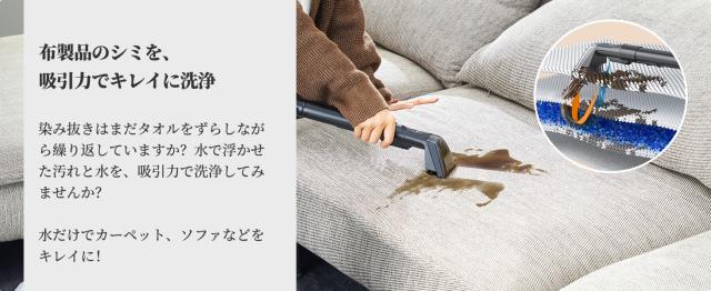 カーペットやソファーなどを復活!12000PA吸引力で布製品に長年蓄積した埃/シミ/カビ/あぶら、子供の食べこぼし、ペットの吐瀉物/粗相/足跡、蓄積された頑固な汚れを奥からどんどん吸い出せる。※適用範囲:敷布団、布製ソファー、布製イス、絨毯、カーペット、ラグ、フロアマット、カーテン、車のシート、布製マットレス、ぬいぐるみ、ペットシートなど。