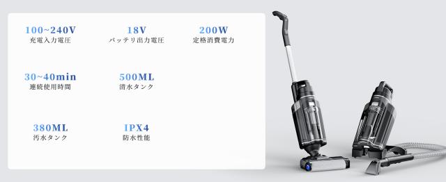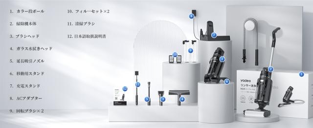 梱包内容:本体×1、電源コード×1、ガラス掃除ノズル×1、, 延長吸引ノズル×1、洗浄機用ホース×1、移動用スタンド×1、回転ブラシ×1、日本語取扱説明書×1