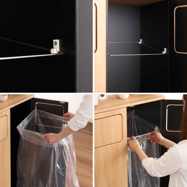 前扉を開き、リングを外して袋をかぶせ、中のフックに引っ掛けるだけで簡単にゴミ袋のセットが完了します。磁石付きなので沢山捨ててもしっかり閉まります。