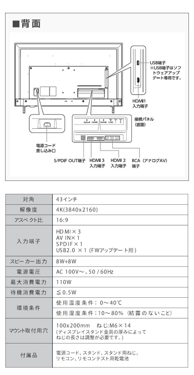 電源コード、スタンド×2、スタンド固定用ねじ×4、リモコン、単4乾電池×2(テスト用)