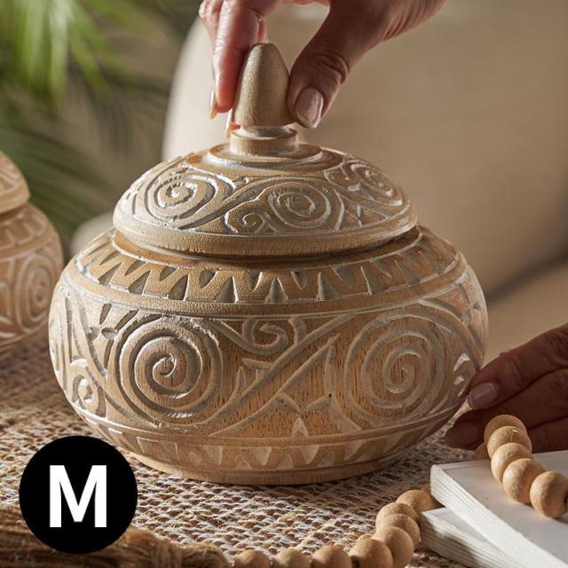 小物入れ 木 製 オブジェ ウッド カービング 手 彫り ふた つき 蓋 付き 収納 フタ 小物 入れ 直径18cm Mサイズ ハンドメイド 彫刻 エスニック 14129