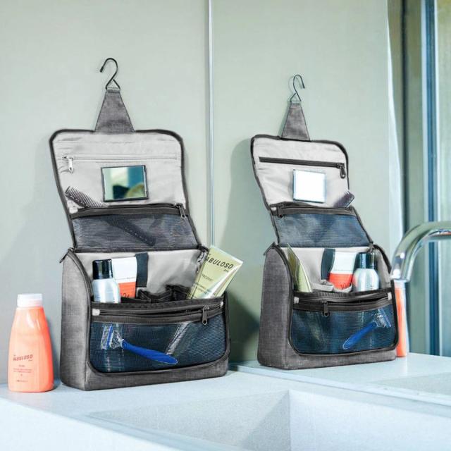 ポーチにはフックが付いているので、バスルームや洗面所に吊り下げてお使いいただけます。ポーチを広げるとドレッサーのように使えるので、身だしなみを整える際に便利です。