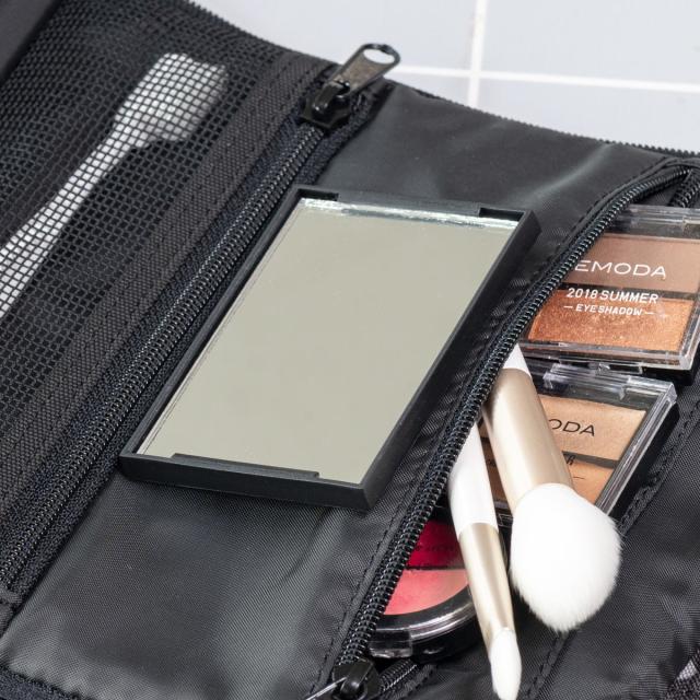 内側に面ファスナーで取り外し可能なミラーが付属しています。お出かけ先や旅行先で鏡がない場面でも安心です。