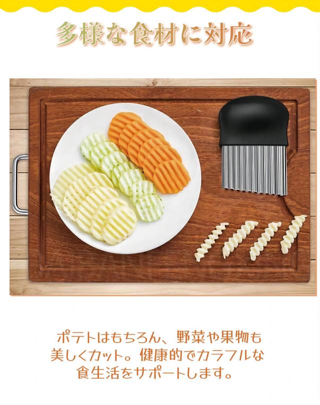 ポテトや野菜を美しい波型にスライスできる特設刃で、あなたの料理が一気にプロ仕様に変身します。キレイな切り口で、見た目も楽しい料理が手軽に実現します。