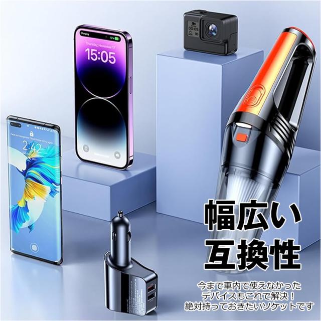 車両のシガーソケットを占有せず、他のシガーソケット対応機器を引き続き利用可能です。スマートフォン、タブレット、モバイルバッテリー、MP3プレーヤー、ゲーム機、カメラ、カーナビ、車用掃除機、車載加湿器など、さまざまなUSB機器に対応しています。