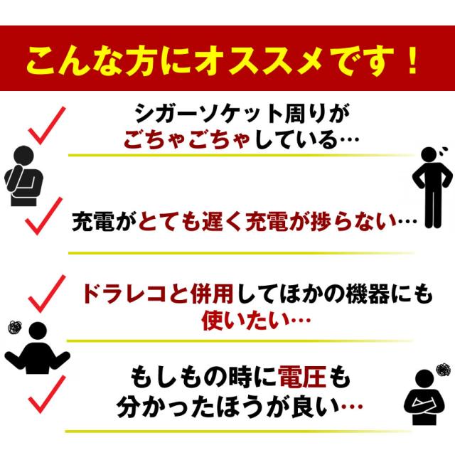 このカーチャージャーは12V〜24Vの車両に対応しており、接続後すぐに車両の電圧を測定します。これにより、車両のメンテナンスの目安として活用できます。