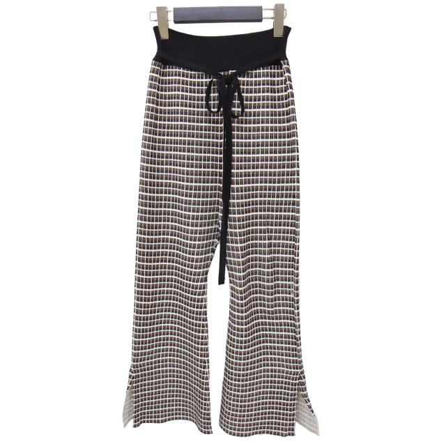CURRENTAGE カレンテージ パンツ ブラック ブラウン ホワイト サイズ:FREE / スクエア柄 ニット フレア パンツ / スリット ハイウエスト ジャガード ウエストリボン / ボトムス ズボン【レディース】【中古】【K4337】