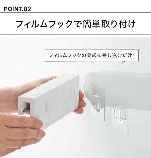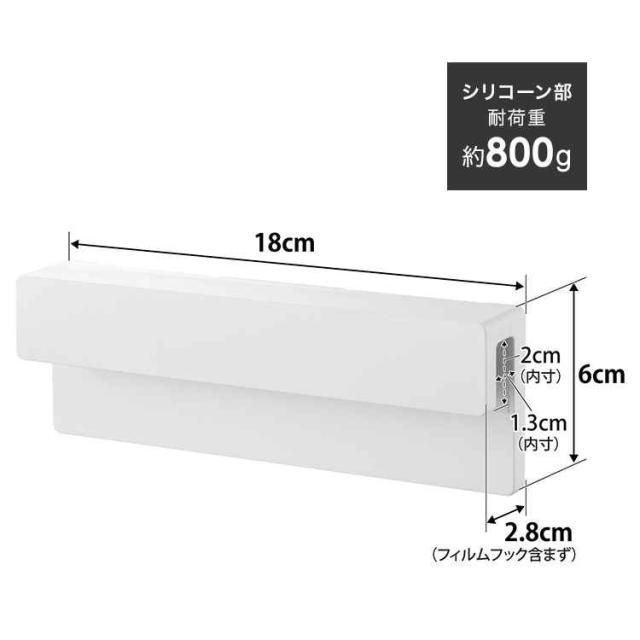 フィルムフックで簡単取り付け。下から差し込むだけで収納できます。1cm毎に入ったシリコーン製の切り込みにより差し込まれた物を1つずつしっかりキャッチします。