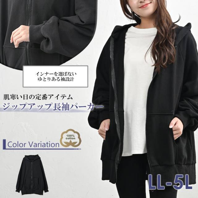 送料無料※沖縄/北海道対象外 大きいサイズ レディース ZIPパーカー 長袖 ジップアップ フーディー 無地 アウター SWT LL/3L/4L/5L ゆったりサイズ ぽっちゃり女子 プラスサイズ