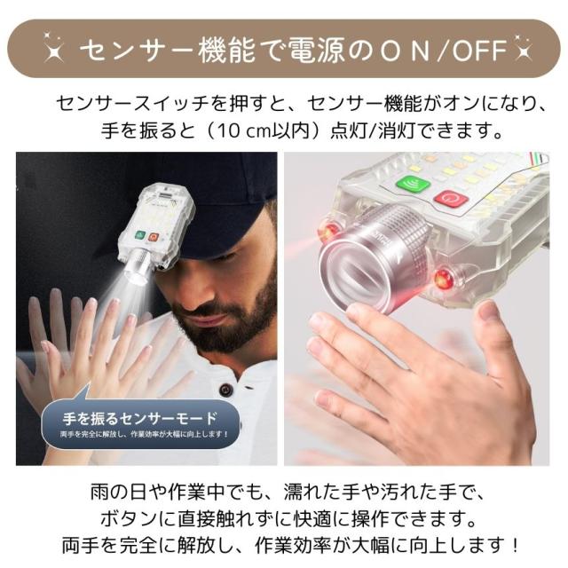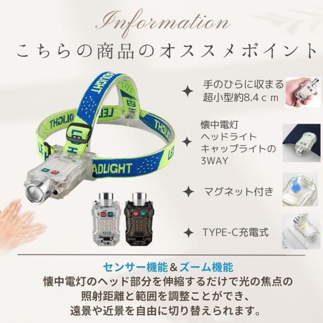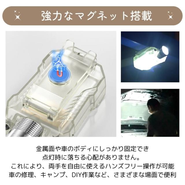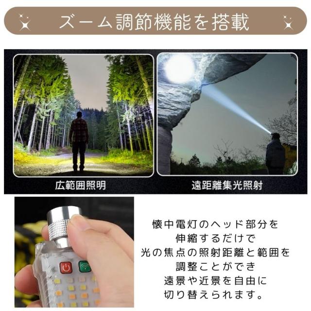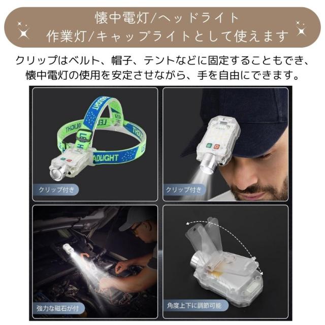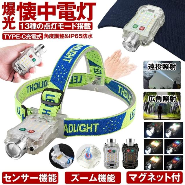 懐中電灯 充電式 小型 ハンディライト 作業灯 ヘッドライト センサー ズーム マグネット led ライト キャップライト クリップ 最強 ハンディ 磁石 USB TYPE-C フラッシュライト 電池残量 表示 角度調整 作業 防水 持ち運び 軽量 キャンプ 防犯 防災