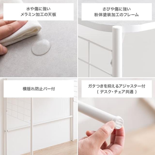 デスク: MDF(メラミン貼り)、アイアン(粉体塗装)チェア: PVC、ウレタンフォーム、MDF、アイアン(粉体塗装)