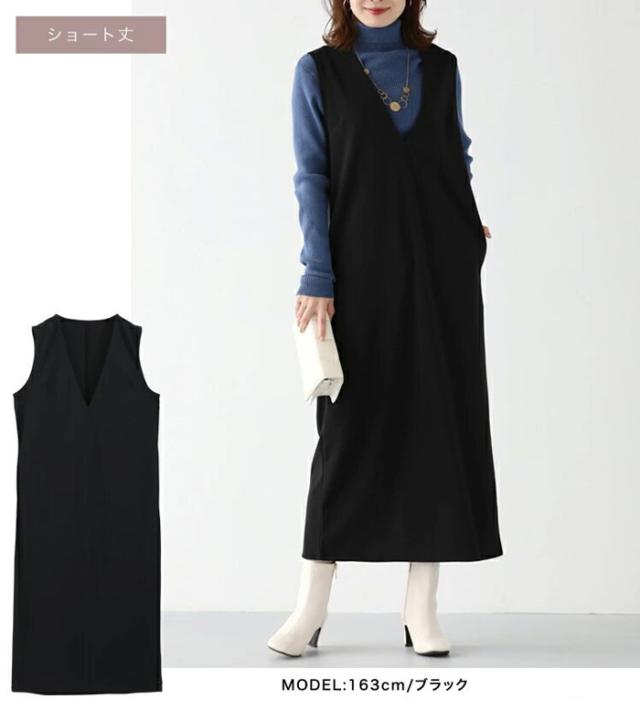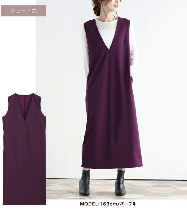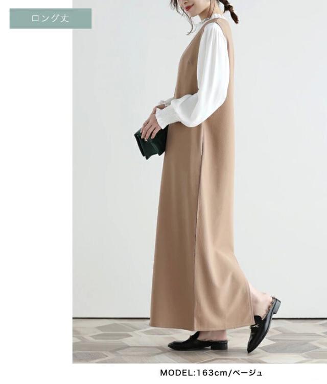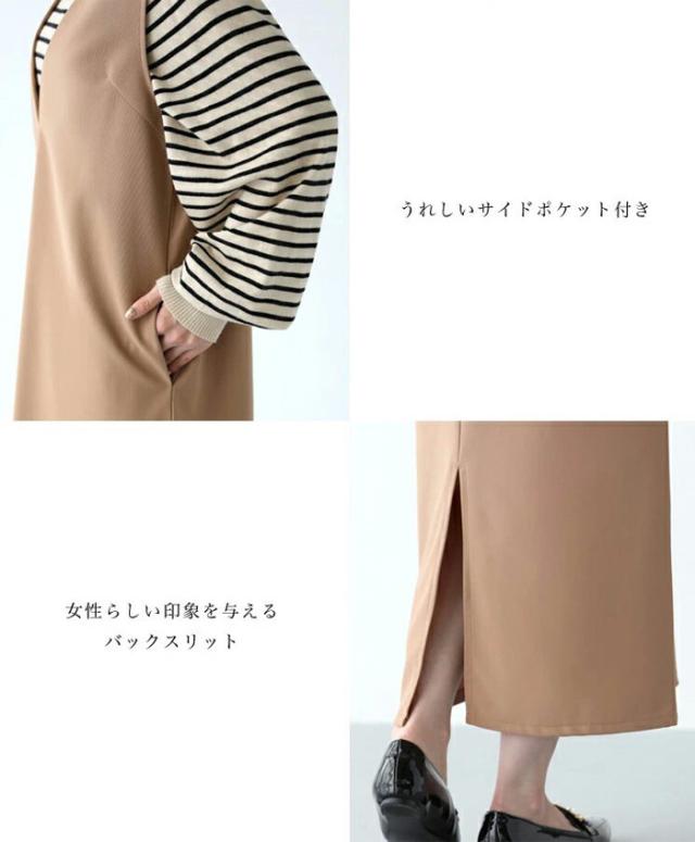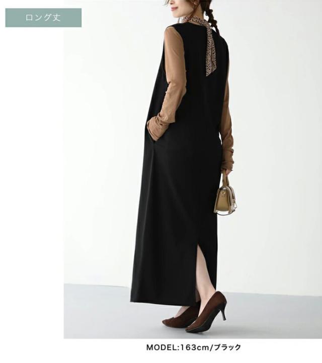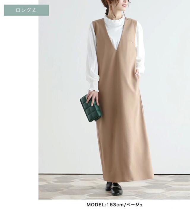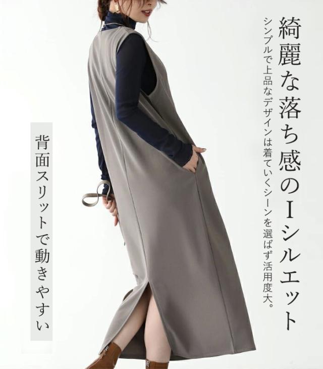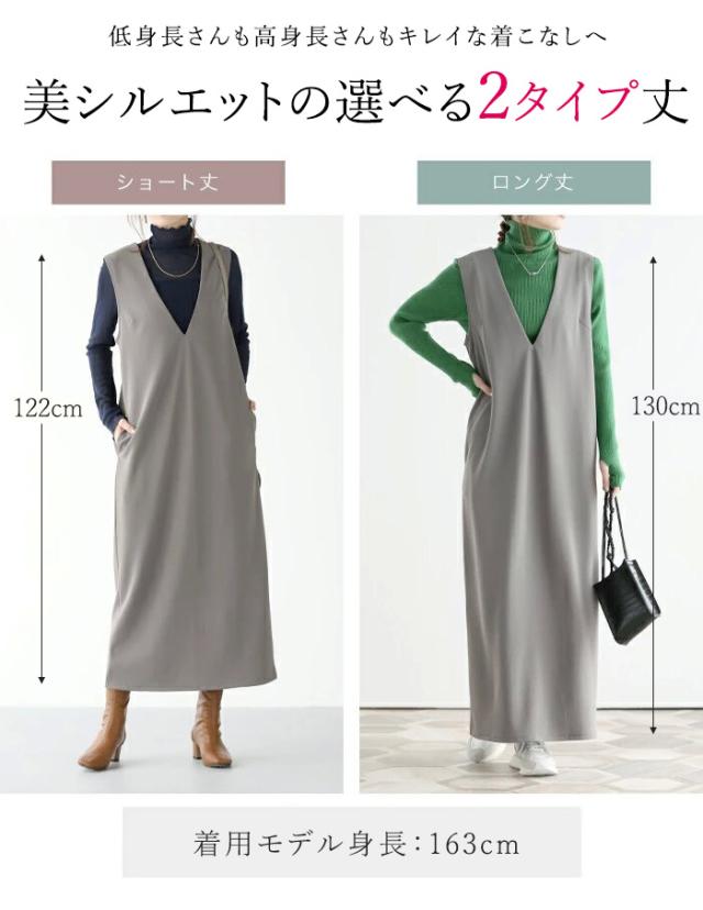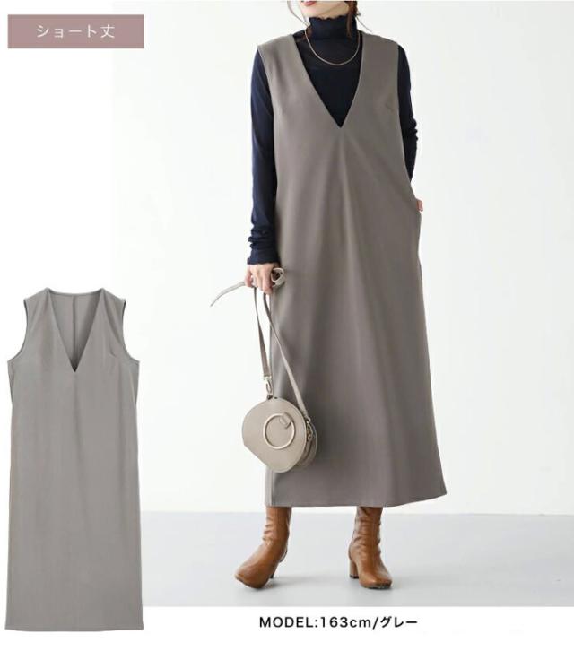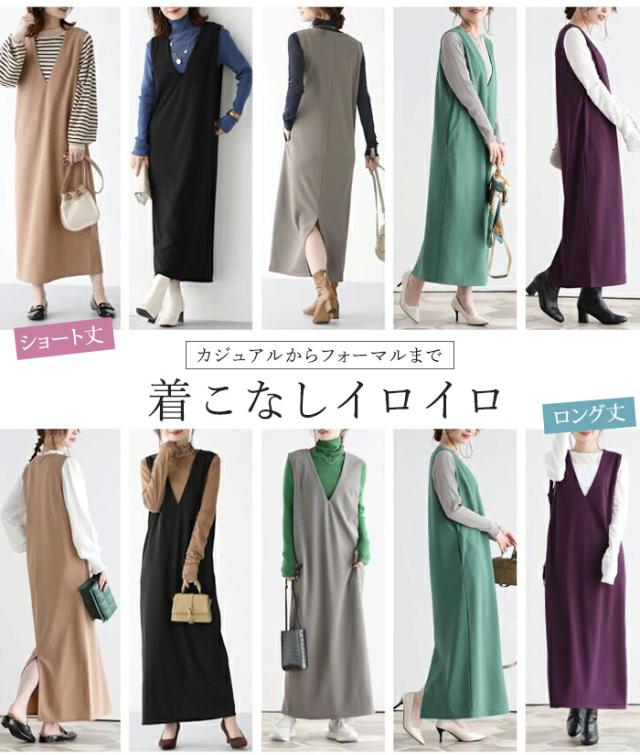 ワンピース ジャンパースカート 丈が選べる ロング丈 ミモレ丈 \新作/ ミディ丈 マキシ丈 春 秋 冬 ポケット付き ジャンスカ きれいめ 深Vネック ロングワンピース Vネック スリット入り 無地 レイヤード カジュアル オフィス スリット dn