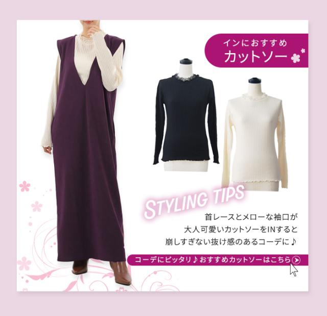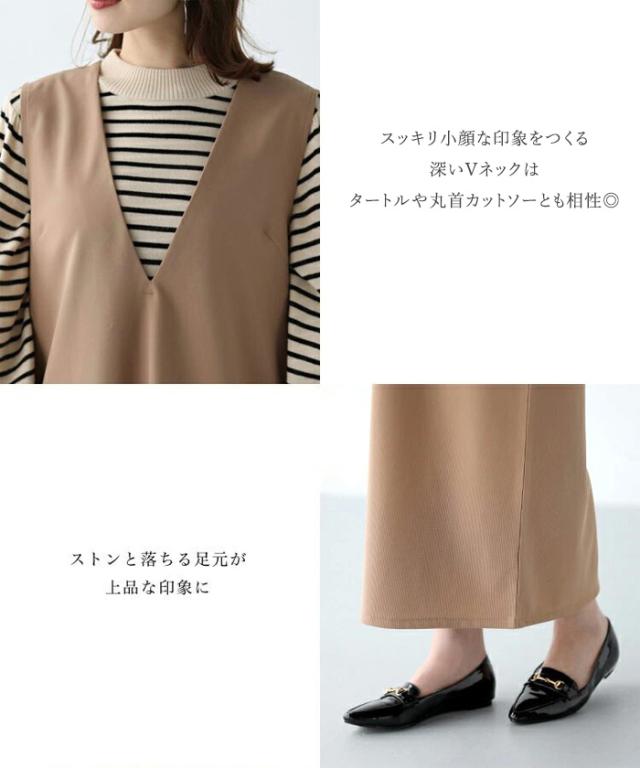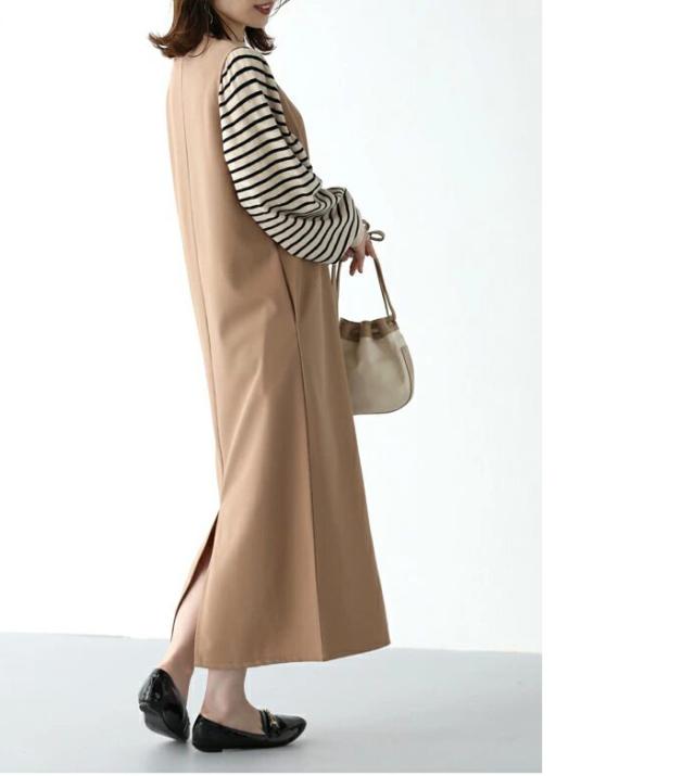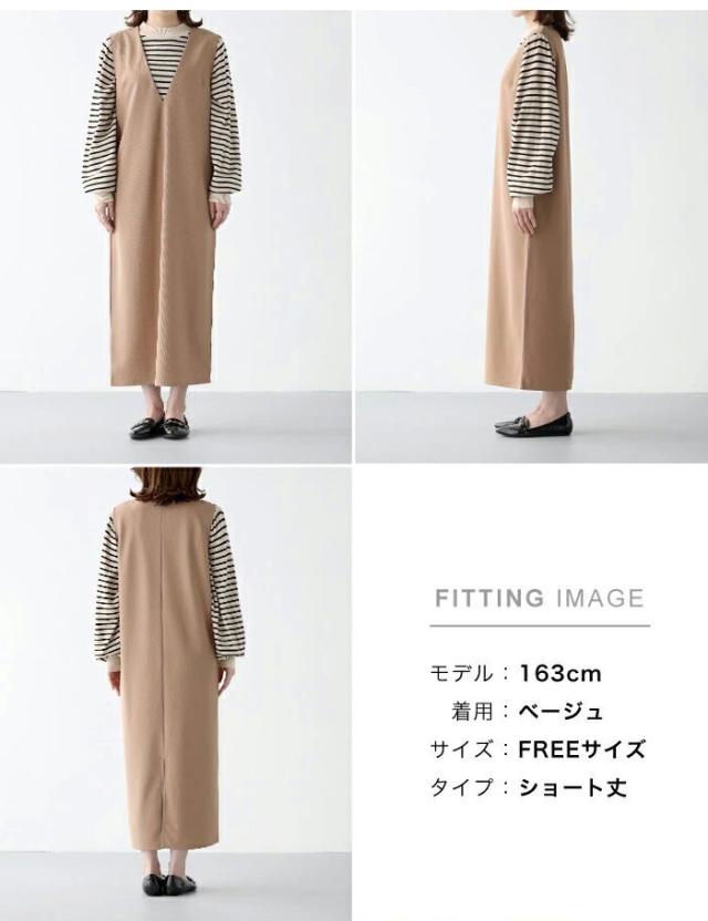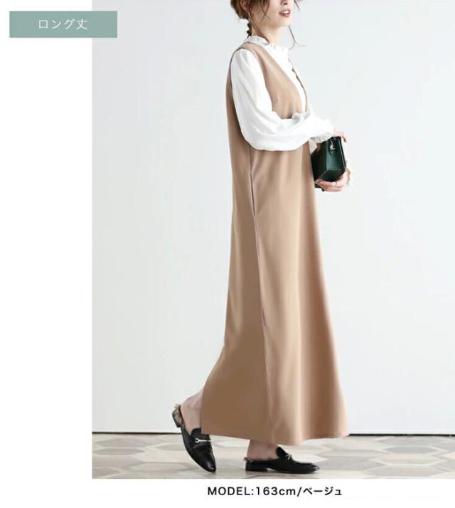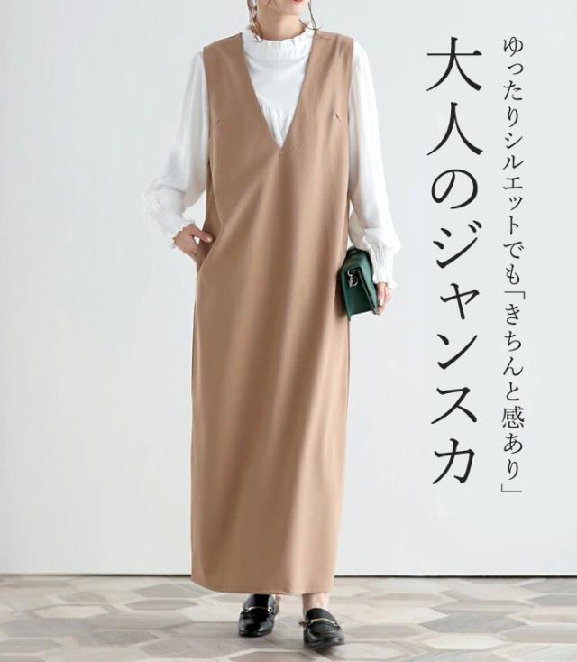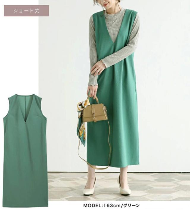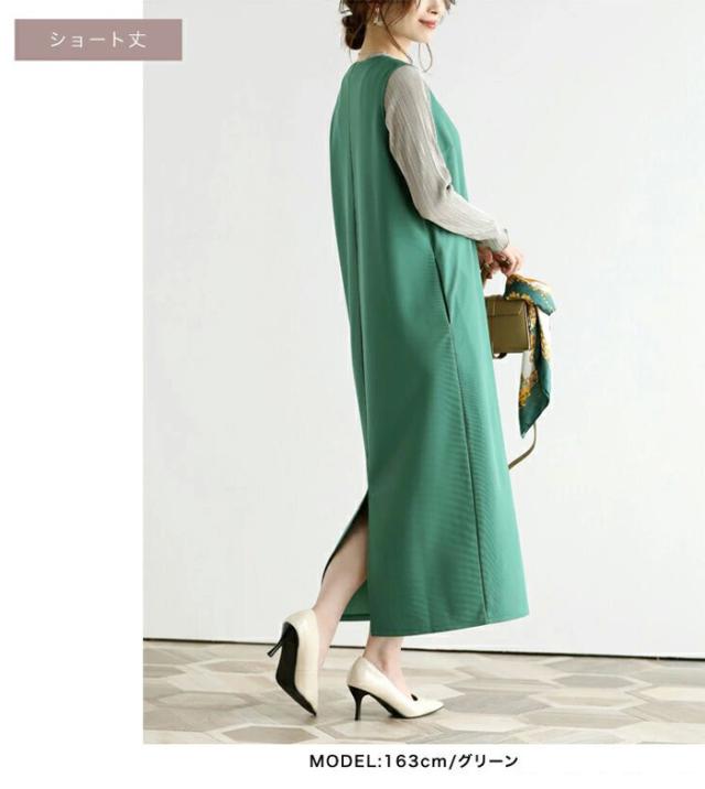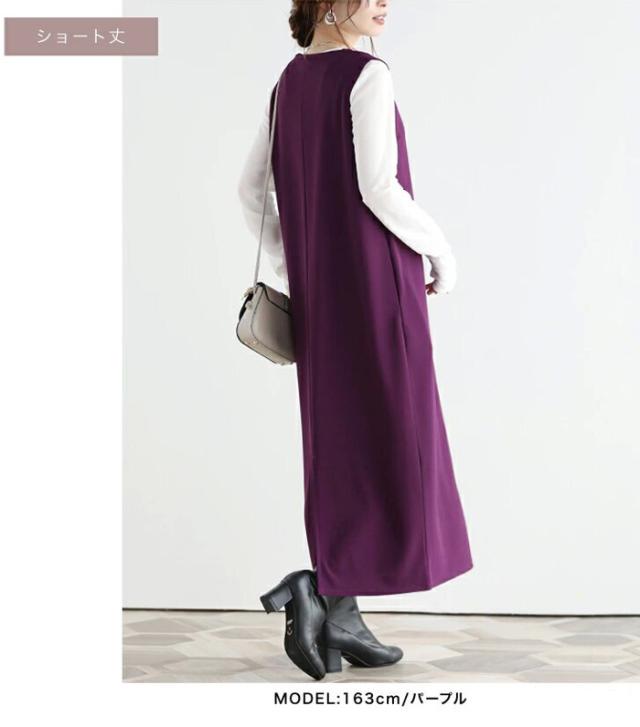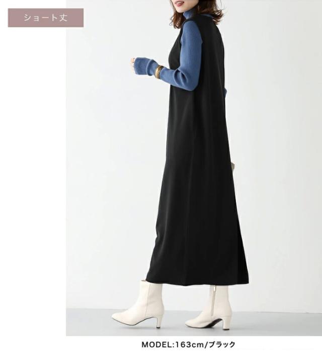 ワンピース ジャンパースカート 丈が選べる ロング丈 ミモレ丈 \新作/ ミディ丈 マキシ丈 春 秋 冬 ポケット付き ジャンスカ きれいめ 深Vネック ロングワンピース Vネック スリット入り 無地 レイヤード カジュアル オフィス スリット dn