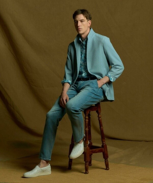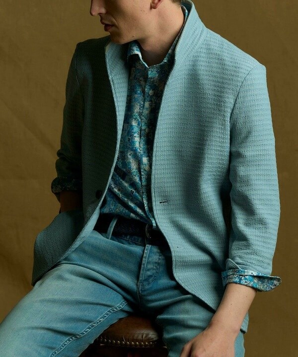 ややタイトめに作られていますが、ウエスト部分には絞りを入れておらずラフな印象を与えます。ですがスッキリと軽い襟元の仕立ても相まって、上品な着こなしが可能です。