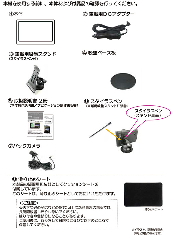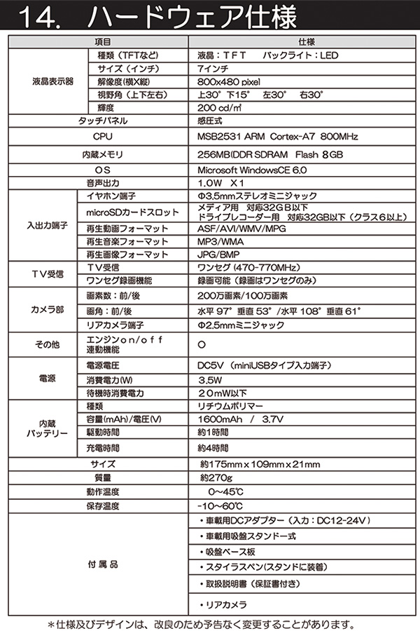 カーナビ+前後ドラレコ フロント(本体)200万画素・リア(リアカメラ)100万画素カメラ搭載 走行中の映像を鮮明に録画することができます。 最新地図データ搭載 2025年度リリース最新地図搭載 SDカードに保存した動画や音楽などのメディア再生することが可能です。 車内を楽しく過ごすことができます。 ■快適なドライブをアシスト ・速度制限機能 走行中に速度注意ゾーンに近づいたら警報が表示されます。 ・トンネルアシスト機能 トンネル内でもナビゲーションが止まることなく作動します。 デモ走行機能搭載! デモ走行で事前にドライブルートを確認できます。 3年間更新無料 (2回までの無料地図更新)が付属しているので最新の地図で走行が可能です 地図の更新は本製品は発表後の翌年から年1回、計2回まで。(毎年春〜夏頃) 更新時期は前後する場合がございます。 【サイズ】 本体:175×109×21mm 【重量】 本体:約270g 【仕様】 ■ハードウェア仕様 ディスプレイ:7インチ 液晶:TFT バックライト:LED 解像度:800x480pixel 視野角(上下左右):上30°下15°左30°右30° 輝度:200cd/m2 タッチパネル:感圧式 CPU:MSB2531 ARM Cortex-A7 800MHz 内蔵メモリ:256MB(DDR SDRAM) Flash 4GB OS:Microsoft WindowsCE 6.0 スピーカー:1.0W x1 イヤホン端子:Φ3.5mmステレオミニジャック マイクロSDカードスロット:メディア用対応32GB以下 ドライブレコーダー用対応32GB以下(クラス6以上) 再生動画フォーマット:ASF/AVI/WMV/MPG 再生音楽フォーマット:MP3/WMA 再生画像フォーマット:JPG/BMP TV受信:ワンセグ(470-770MHz) ワンセグ録画機能:録画可能(録画はワンセグのみ) カメラ部:画素数:200万画素/100万画素 画角:水平97°垂直53° 水平105°垂直60° エンジンON/OFF連動:〇 電源電圧:DC5V(miniUSBタイプ入力端子) 消費電力(W):3.5W 待機時消費電力:20mW以下 内蔵バッテリー:リチウムポリマー 容量/電圧:1600mAh/3.7V 駆動時間:約1時間 充電時間:約4時間 動作温度範囲(℃):0〜45℃ 保存温度範囲(℃):-10〜60℃ ■生産地:中国 ■素材・成分:■ソフトウェア仕様 全国道路地図:OpenStreetMap製2025年度リリース 昼夜画面切り替え:○(昼:夜手動/自動切替) 縮尺切り替え:○12段階(25m~100km) ルート検索機能:推奨ルート?高速優先?一般優先?最短距離?複数ルート表示(高速優先、一般優先、最短距離) リルート機能:○(自動?手動) トンネルアシスト:○(ナビ走行時) スカイモード:〇 左右折案内:〇(大文字左右折表示) 一方通行表示:〇(地図尺度50m以下) 到着予想時刻表示:〇 目的地までの距離表示:〇 オービス情報:○(音声警告?位置文字表示) 高速道路表示:〇(スクロール機能付) 地図表記言語:日本語 ノースアップ/ヘッドアップ切替:○(北方向上/自車方向上)切替 スマートIC対応:〇 デモ走行機能:〇 住所検索:約3500万件 電話番号検索:約420万件 周辺施設検索:約65万件 名称検索:約67万件 登録地点件数:220件×6カテゴリー 目的地履歴:100件 自宅登録:〇 |