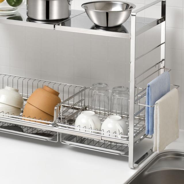 ベースラックに専用パイプ(別売)を取り付けて2段にすれば、水切りバスケットを下段に取り付けることができます。ライフスタイルに合わせてレイアウトを自由に変えることができて便利です。