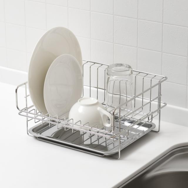 同シリーズ別売のベースラックと組み合わせて使えるコンパクトな水切りバスケットです。よく使う食器やコップなど少量の洗い物にピッタリ。お皿を立てて収納できる形状なので、出し入れしやすく乾きやすいです。
