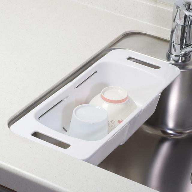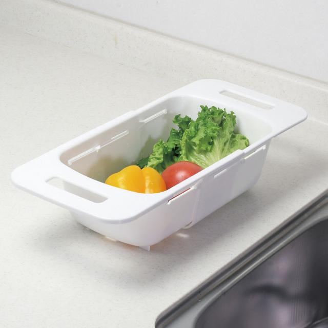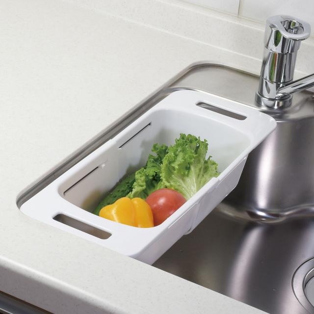 シンクの端のスペースに設置して使える伸縮水切りかごです。ちょっとした洗い物や洗った野菜の水切りなどに使いやすいです。シンク内に水切りを設置することで、作業スペースを広く確保することができて料理がしやすくなります。