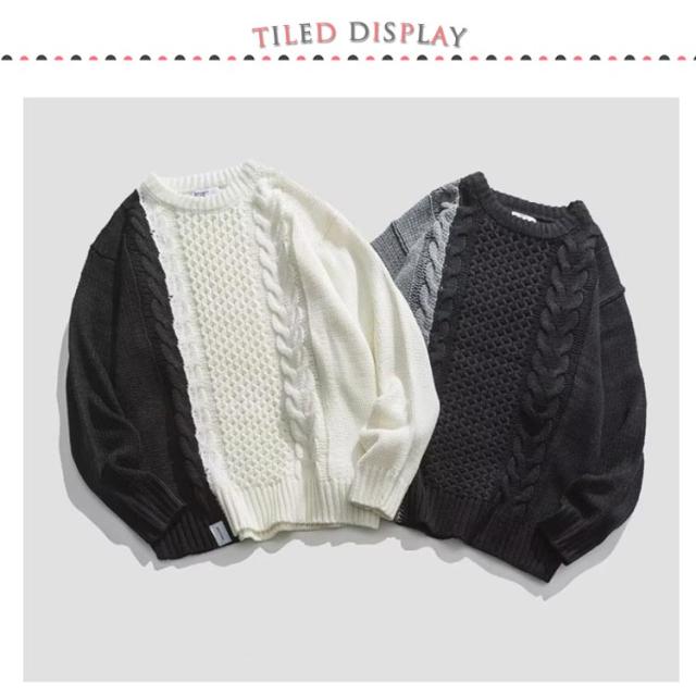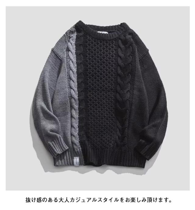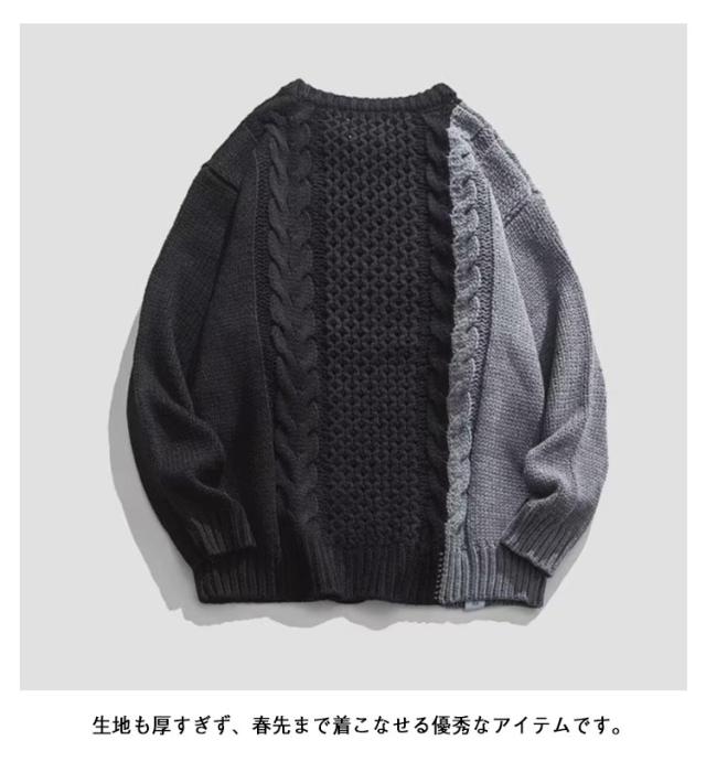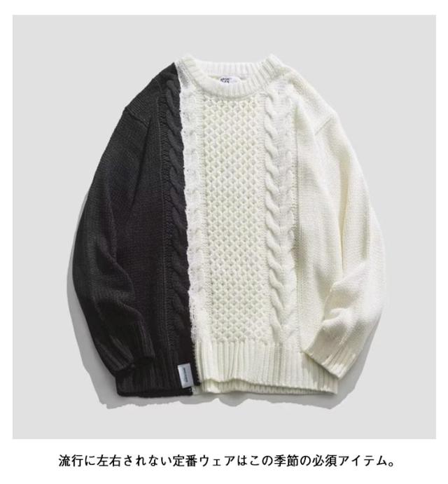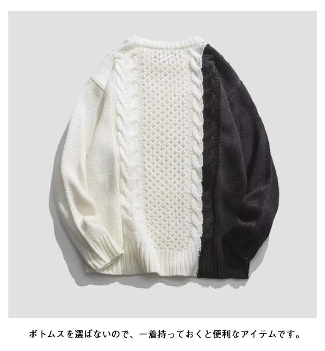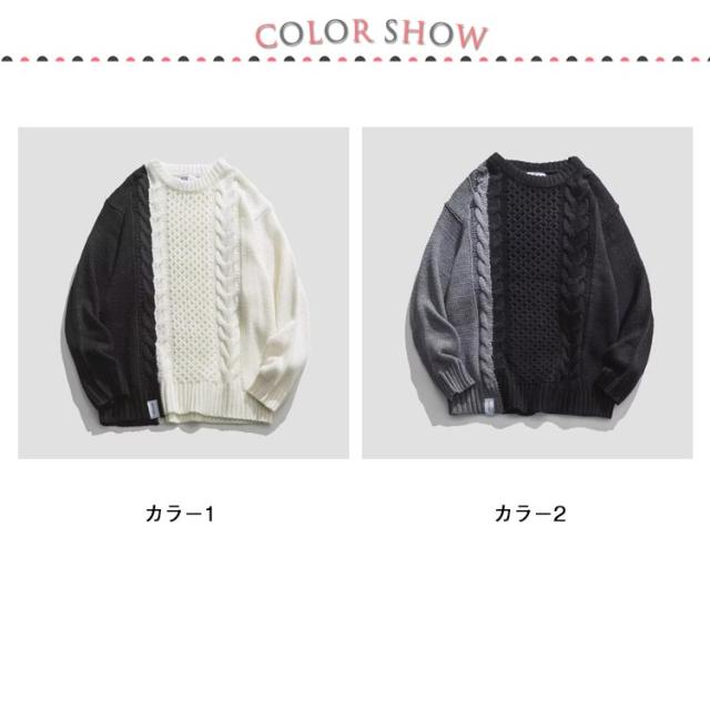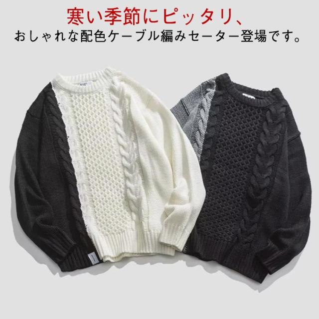 配色 ケーブル編み ニット メンズ セーター ニットセーター 長袖 ニットトップス ケーブル編みニット 切り替え 秋 冬 秋服 冬服 カジュアル カップル M L XL 2XL