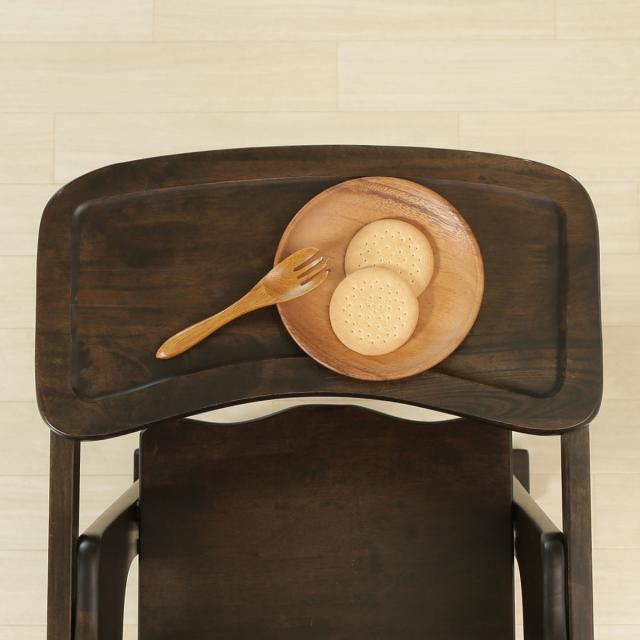 テーブルにはフチが付いているので、食器や食べ物が落下するのを防ぎます。テーブルを使わないときは、後ろに回すことができるので邪魔になりません。