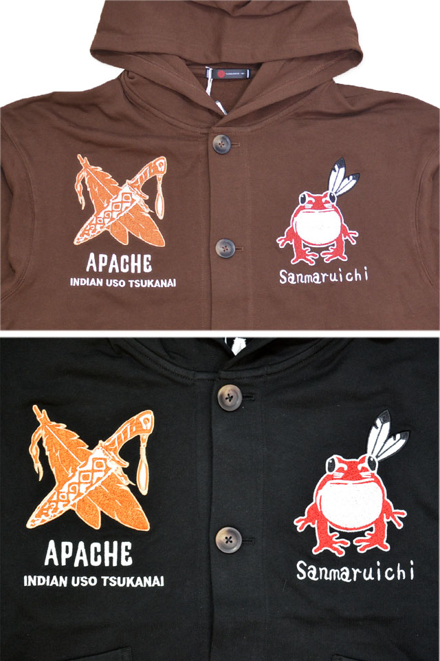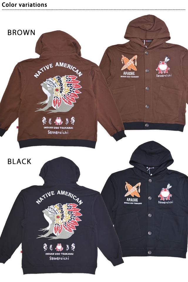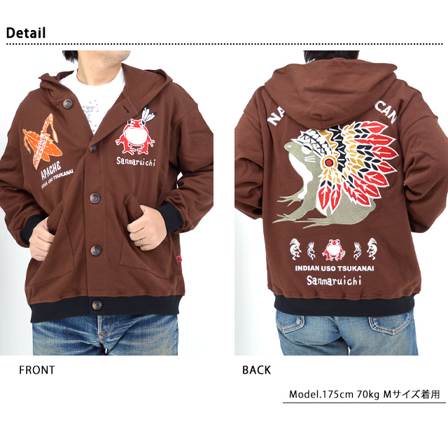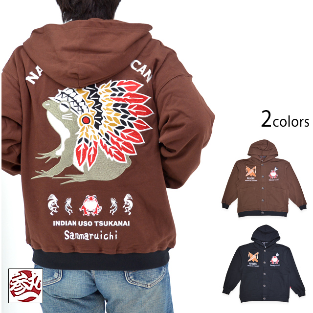 インディアン嘘つかない 長袖ボタンパーカー 参丸一 SM-30832 和柄 和風 蛙 カエル 刺繍