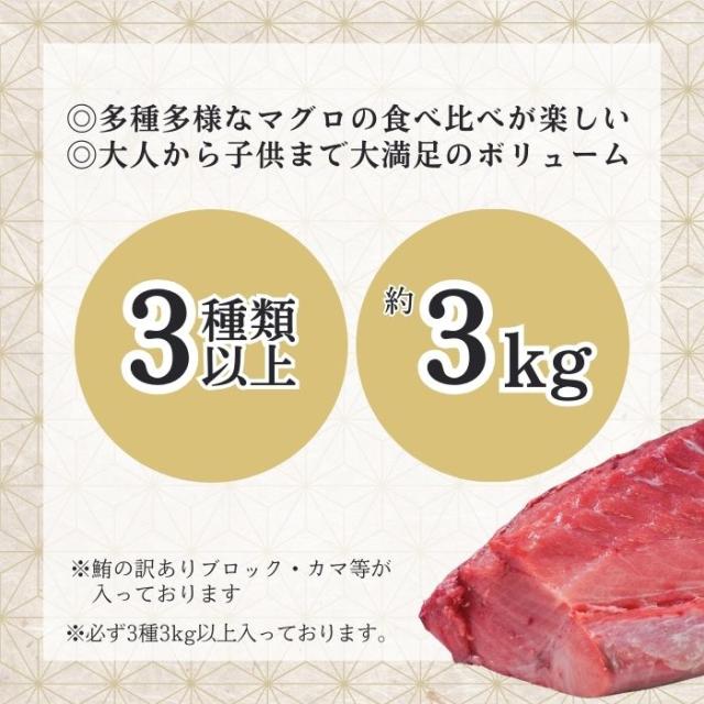 送料無料 まぐろ 福袋 3種 約 3kg 天然まぐろ 中トロ入り メバチ鮪 本鮪 南鮪 等々 寿司 刺身 煮物 BBQ 赤身 カマ 中落 海鮮 業務用 大容量 豪華 マグロ 高級 訳あり
