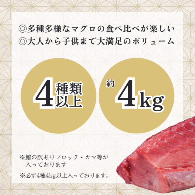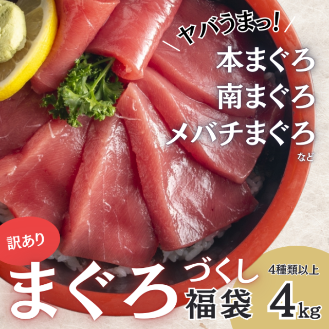 送料無料 まぐろ 福袋 4種 約 4kg 天然鮪 メバチ鮪 本鮪 南鮪 等々 赤身 中トロ カマ 血合 肉 等 海鮮 づけ 漬け 業務用 大容量 豪華 マグロ 高級 訳あり