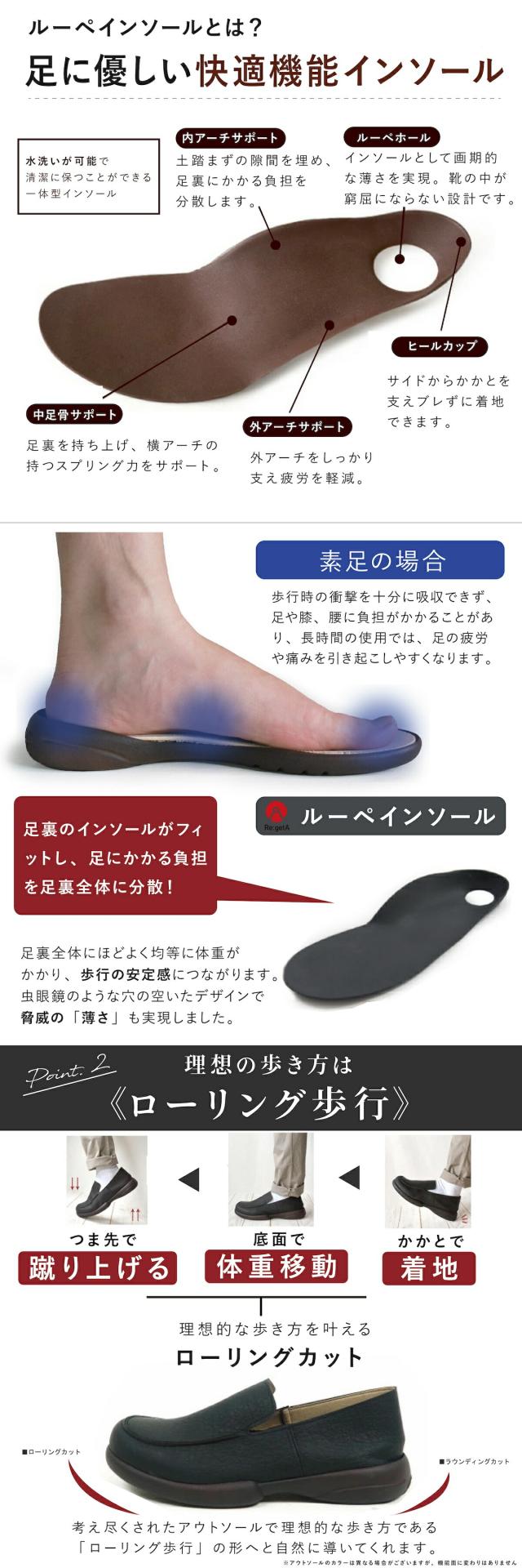 中敷きにはリゲッタならではの「ルーペインソール」を採用。計算された凹凸が足裏に程よくフィット!一定の箇所に集中しがちな足圧を分散して足にかかる負担を軽減する効果に期待できます。