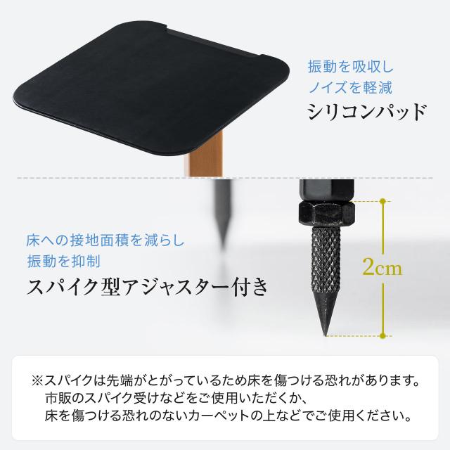 スパイク型アジャスターは先端を尖らせることで地面への接地面積を減らし、振動を制御することで音の純度を高めます。