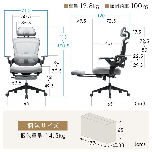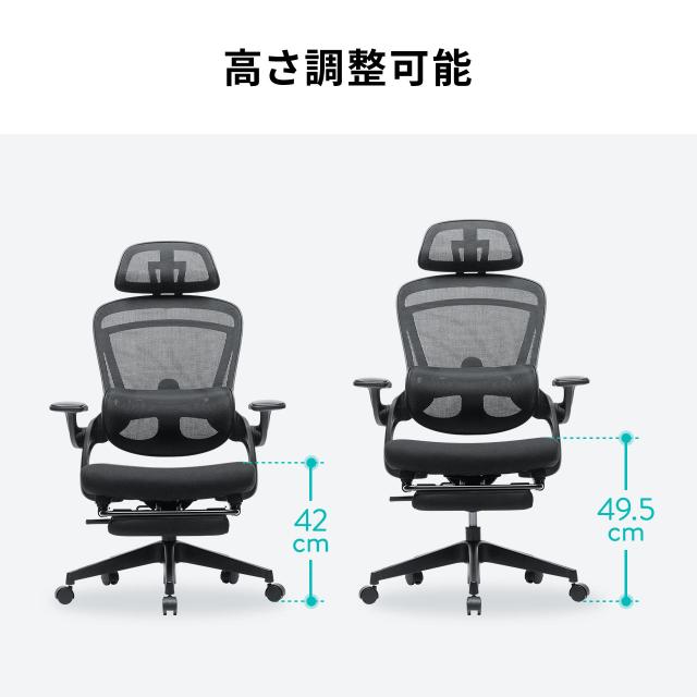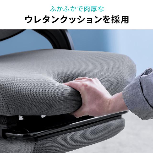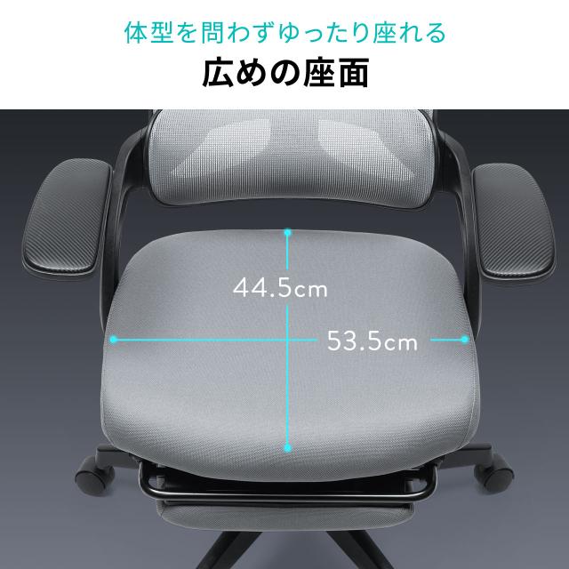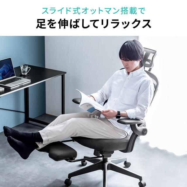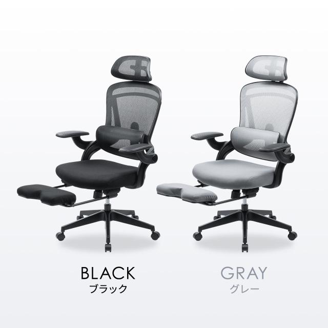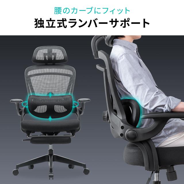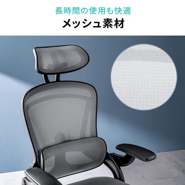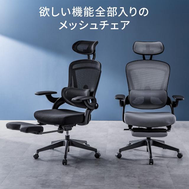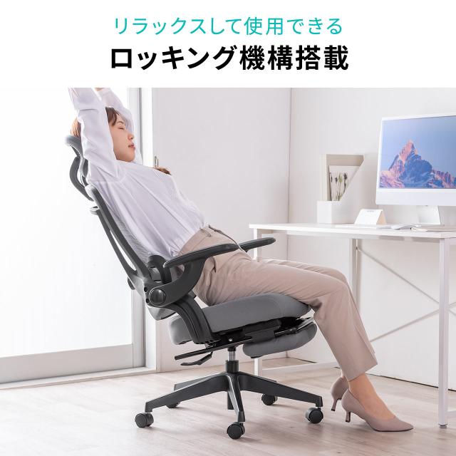 メッシュチェア オフィスチェア オットマン付き ロッキング 跳ね上げアームレスト ランバーサポート ヘッドレスト付き キャスター ブラック グレー[150-SNCM50]
