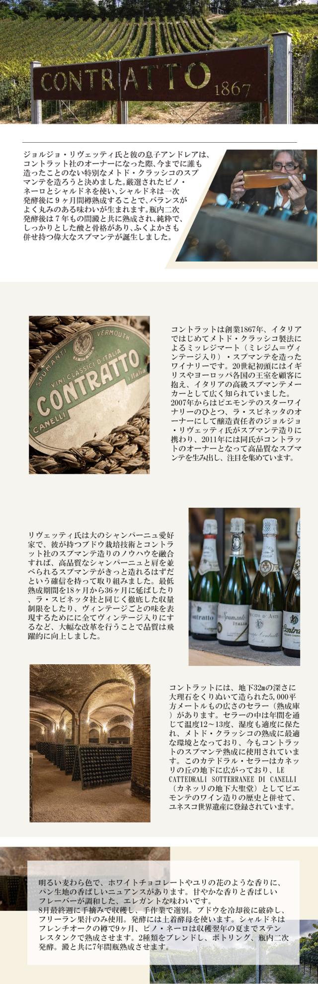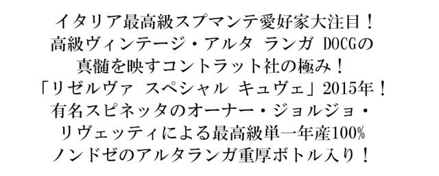 イタリア最高級スプマンテ愛好家大注目! 高級ヴィンテージ・アルタ ランガ DOCGの 真髄を映すコントラット社の極み! 「リゼルヴァ スペシャル キュヴェ」2015年! 有名スピネッタのオーナー・ジョルジョ・ リヴェッティによる最高級単一年産100% ノンドゼのアルタランガ重厚ボトル入り!