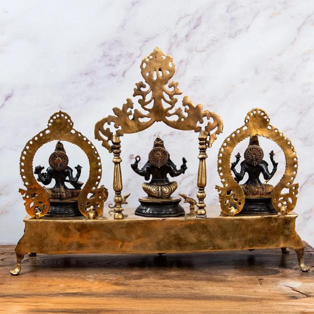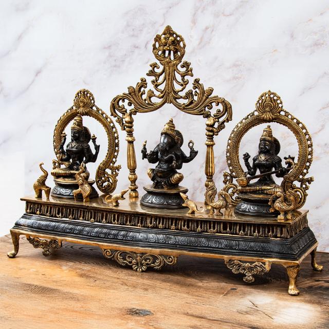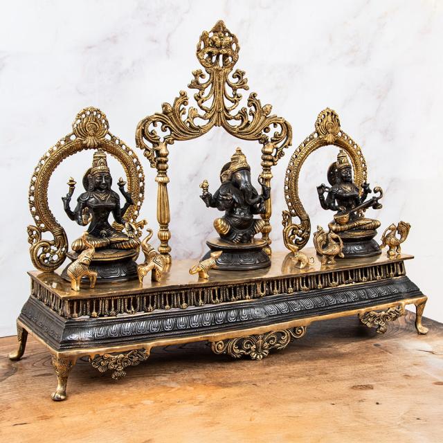 【送料無料】 【1点物】真鍮黒塗仕上げ ガネーシャ ラクシュミ サラスヴァティ 三柱坐像祭壇 高さ59cm 21kg / ガナパティ ラクシュミー サラスバティ インド 神様 置物 エスニック アジア 雑貨