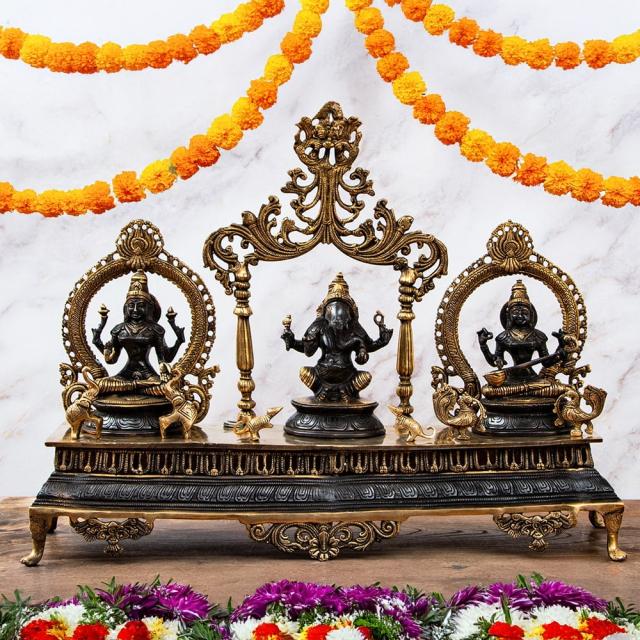 インドの偉大なる神々、ガネーシャ・ラクシュミ・サラスヴァティが一堂に会した祭壇です。ガネーシャは障害を取り除き、成功と繁栄をもたらす神とされています。新しい始まりや困難の克服を象徴します。ラクシュミは富、繁栄、幸福を司る女神で、物質的な豊かさと霊的な繁栄の象徴です。サラスヴァティは知恵、学問、芸術の女神で、精神的な成長や知識の追求を象徴します。これら三柱が一緒に表現されることで、成功(ガネーシャ)、繁栄(ラクシュミ)、知恵(サラスヴァティ)の調和を象徴し、人々の人生がバランスよく充実することを願う意味が込められます。