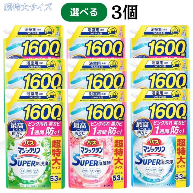 超特大 バスマジックリン 詰め替え 3個 香りが残らないタイプ グリーンハーブ アロマローズ 泡洗浄 業務用 1600 大容量 まとめ買い セット サイズ 大きい ピンク汚れ カビ 黒カビ 防ぐ スポンジ除菌 除菌 泡 浴室用 浴槽 バス マジックリン