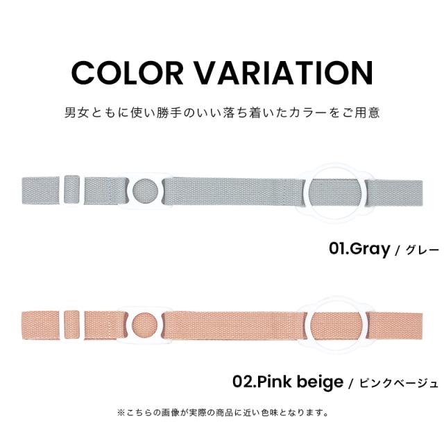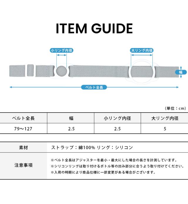 〇カラー:グレー/ピンクベージュ 〇サイズ:ベルト全長79〜127cm/幅2.5cm/小リング内径2.5cm/大リング内径5cm 〇素材:ストラップ(綿100%)/リング(シリコン) |