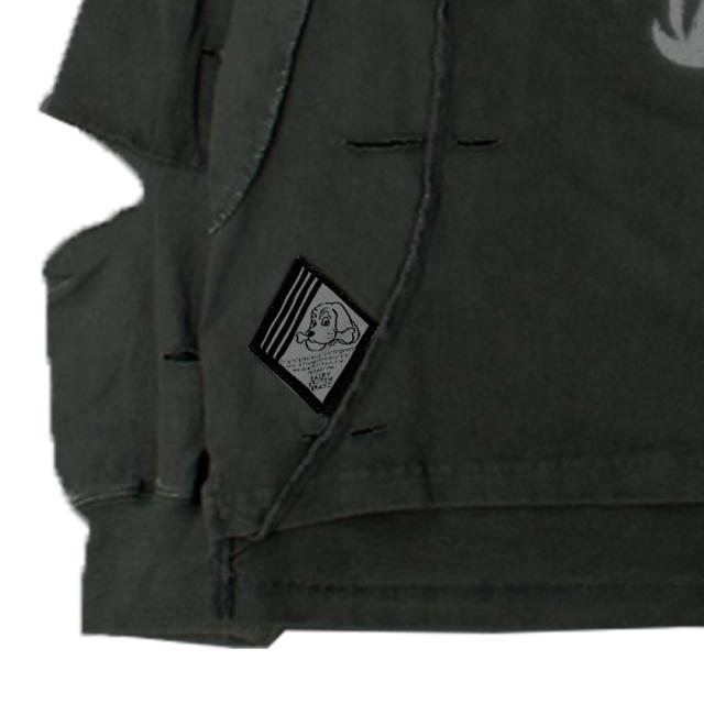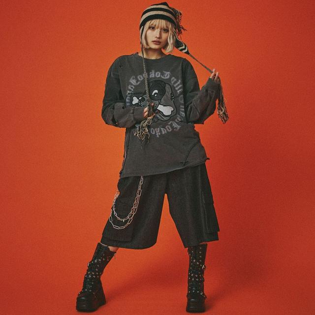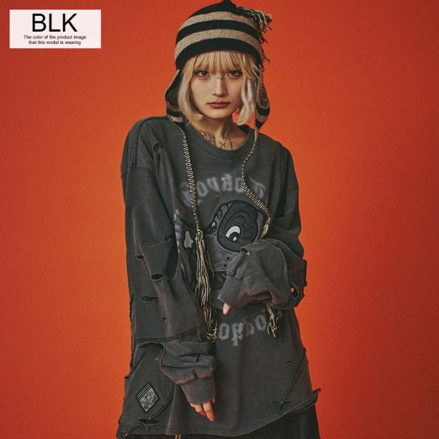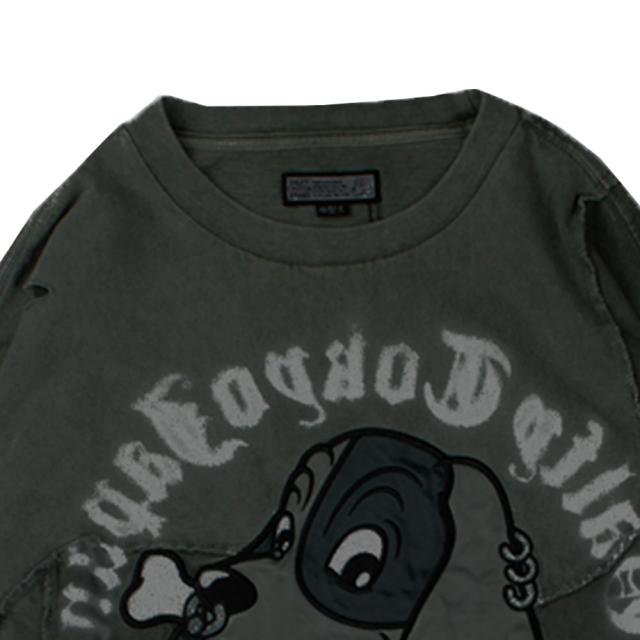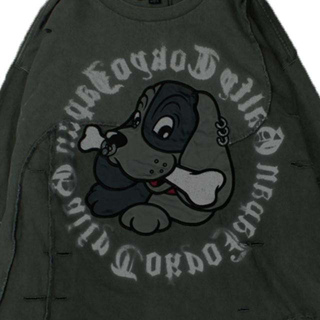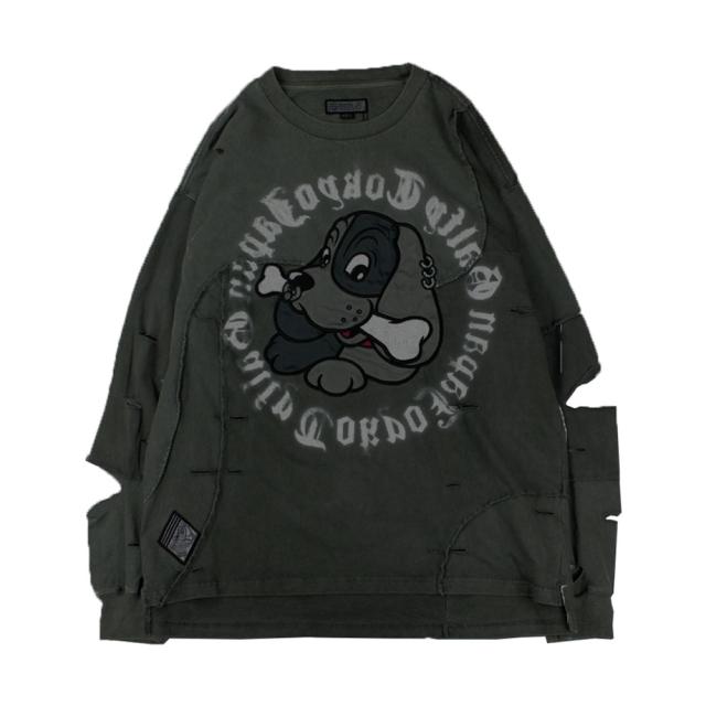 フロントに大きくワンちゃんがデザインされ、ツギハギやダメージの入ったインパクト抜群の長袖Tシャツ。
