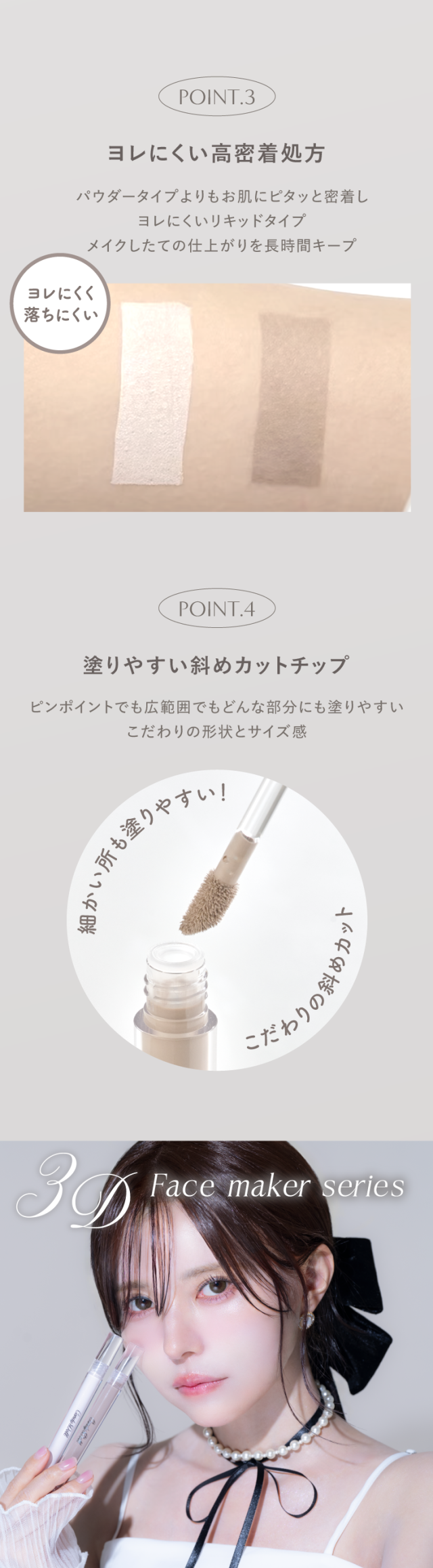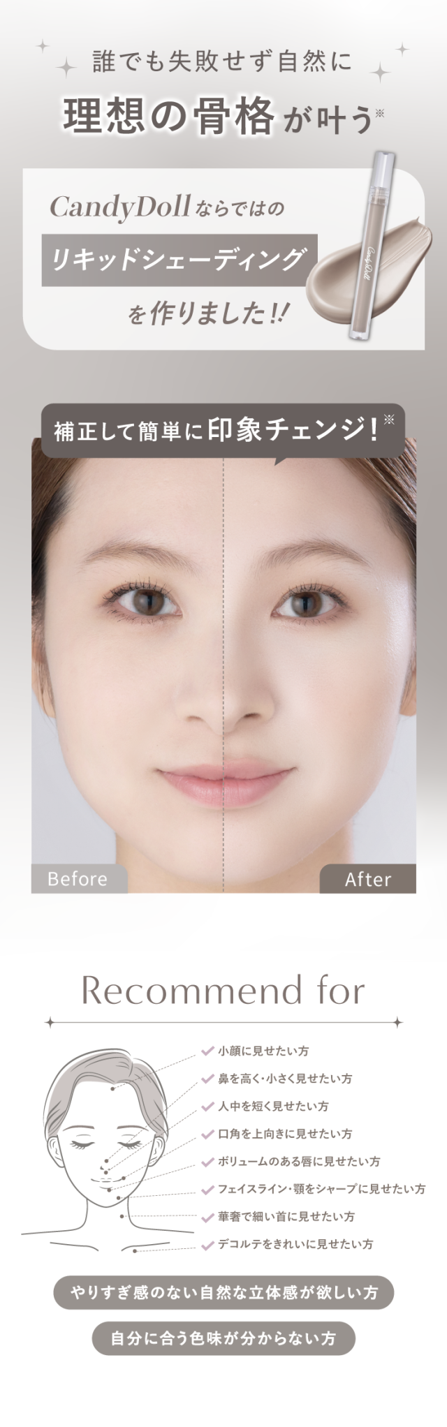 フェイスライン・おでこ周り・鼻筋・鼻先・鼻下・唇の山・唇の下などの陰影をつけたい部分にチップで直接塗布し、指またはブラシでなじませてください。