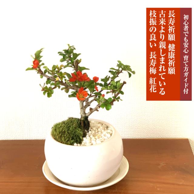 盆栽 長寿梅 育て方ガイド付 ミニ盆栽 紅花 四季咲 3色の選べる鉢色 自宅でお花見 育てやすく毎年開花しやすい樹種 苔植物 盆栽 ミニ 室内 初心者 還暦 花 インテリア フラワーギフト 誕生日 プレゼント