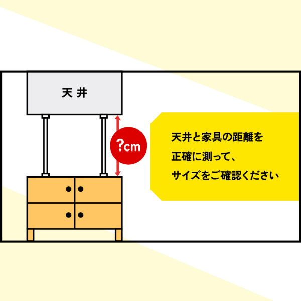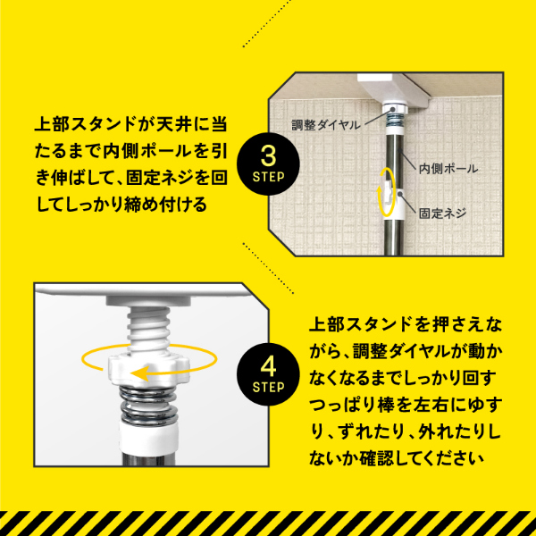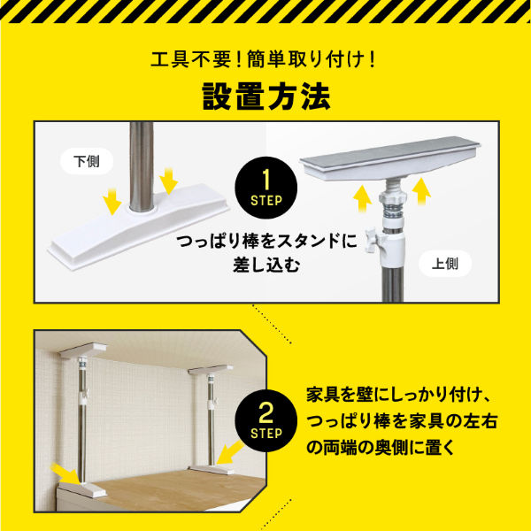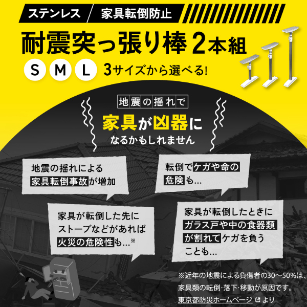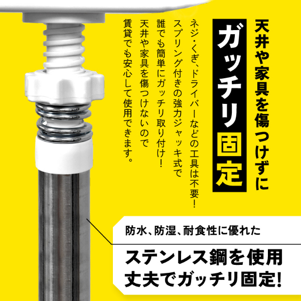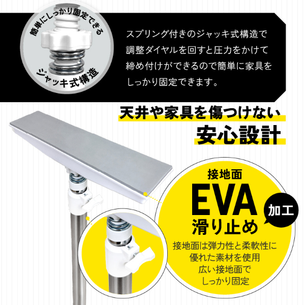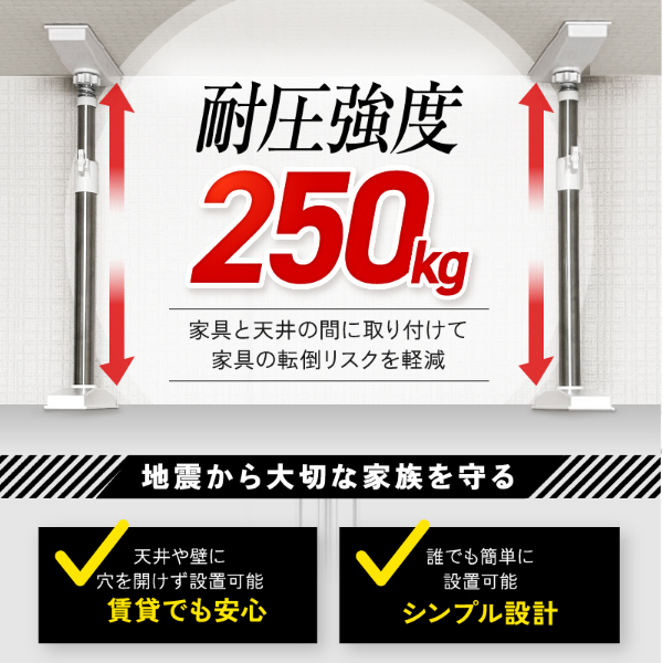 グラっと来ても、ガッチリ固定!家具の転倒を防止する突っ張り耐震棒です。家具と天井の間に取り付けて、地震などによる転倒リスクを軽減します。強力ジャッキ式でガッチリ固定します。ネジ・工具不要、女性でも簡単取り付けられます。接地面は家具や天井が傷がつきにくいように滑り止め加工(TPR)を施しています。パイプ部分は防水、防湿、耐食性に優れたステンレス鋼を使用しています。お部屋に合わせやすいすっきりスマートなデザインです。