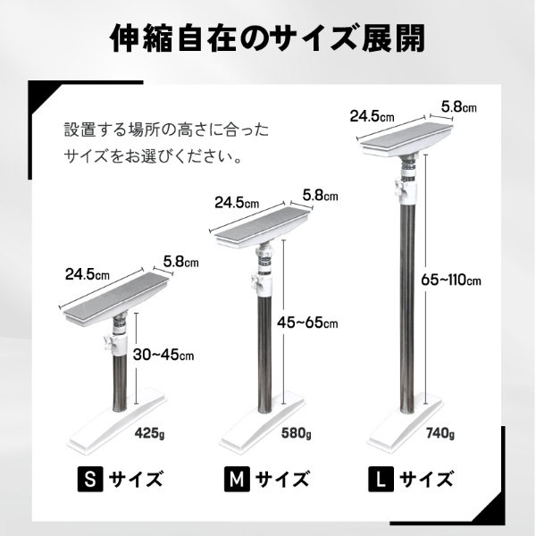 【サイズ・重量(約)】Mサイズ:24.5×5.8×45〜65cm、580g【材質】ステンレス巻きスチール、ABS樹脂、EVA【耐圧強度(約)】250kg【セット内容】突っ張り棒×2本、スタンド×4本【生産国】中国