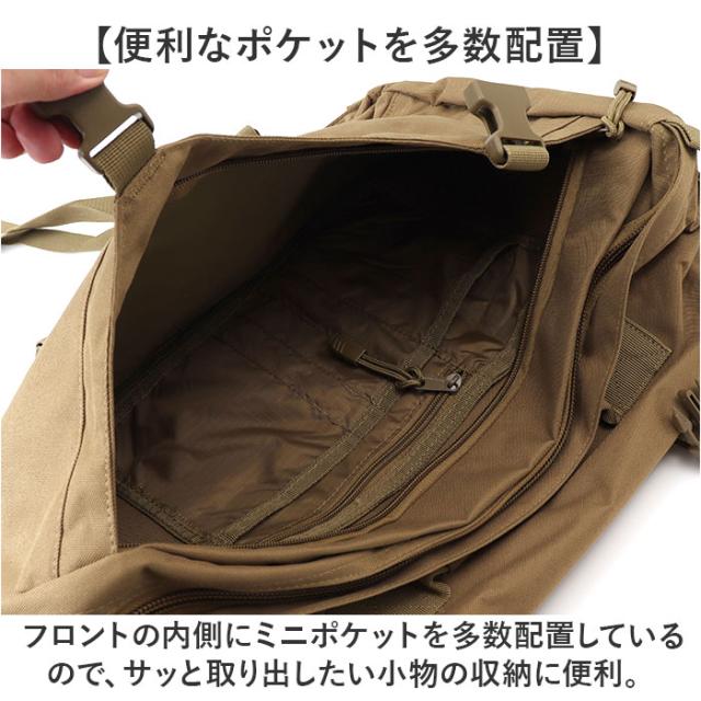 | 商品説明 | 【本格的なミリタリースタイル】 ・機能性とファッション性を兼ね備えた「オランダタイプ NATO フィールドリュック」が登場。 【大きく開くファスナー仕様】 ・開口部は180度大きく開くダブルファスナー仕様。中身が確認しやすく、出し入れもラクラク。 【収納力抜群の大容量】 ・メインルームはB4サイズが余裕で入る大容量!お出かけに必要な荷物をザクザクと入れられる◎ 【仕切りにもなるメッシュポケット】 ・内側にはメッシュファスナーポケットを装備。開くと荷崩れ防止のバックルベルト2本付き。 【便利なポケットを多数配置】 ・フロントの内側にミニポケットを多数配置しているので、サッと取り出したい小物の収納に便利。 【持ち方選べる3WAYタイプ】 ・リュック、手持ち、付属のショルダーベルトで肩掛けスタイルにとお好みの持ち方ができる! 【スッキリ持てる】 ・肩掛けタイプで使用する時、リュックのショルダーは背面に収納OK。スッキリとした印象に。 【体にしっかりフィット】 ・リュックで使う時、チェストベルトやウエストベルトで固定すればズレ落ちを防止! 【長さや荷物幅の調節OK】 ・サイドには荷物の幅を調節できるベルト付き。ショルダーベルトは体に合わせて長さ調節OK。 【快適な背負い心地】 ・ショルダーベルトの裏側はクッション性のあるメッシュ生地を使用し、ムレにくく快適。 【ユニセックスで使える】 ・普段使いはもちろん、キャンプや2泊3日程度の旅行にも使える大きめサイズ。 【ポケット仕様】 ・メイン:メッシュファスナーポケット×1 ・フロント:ファスナーポケット×1(内側:オープンポケット×3、ファスナーポケット×1、ペンポケット×3) ・バック:ファスナーポケット×1(ショルダーベルト収納ポケット) |